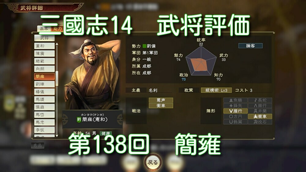 『三國志14』武将能力:簡雍の評価はいかに?【三国志武将評価シリーズ・その138】|三国志14